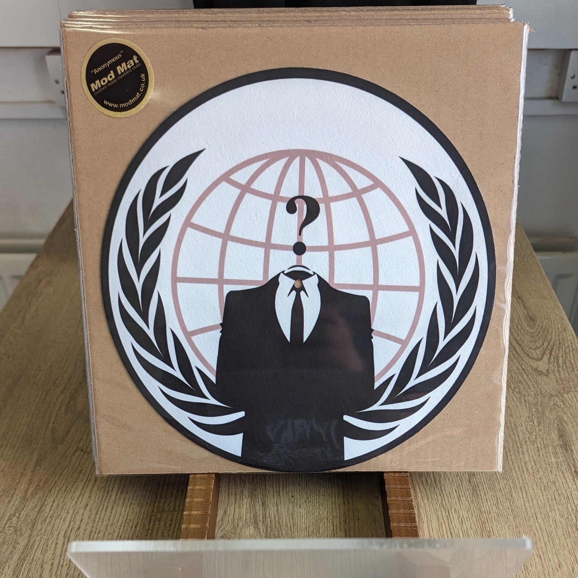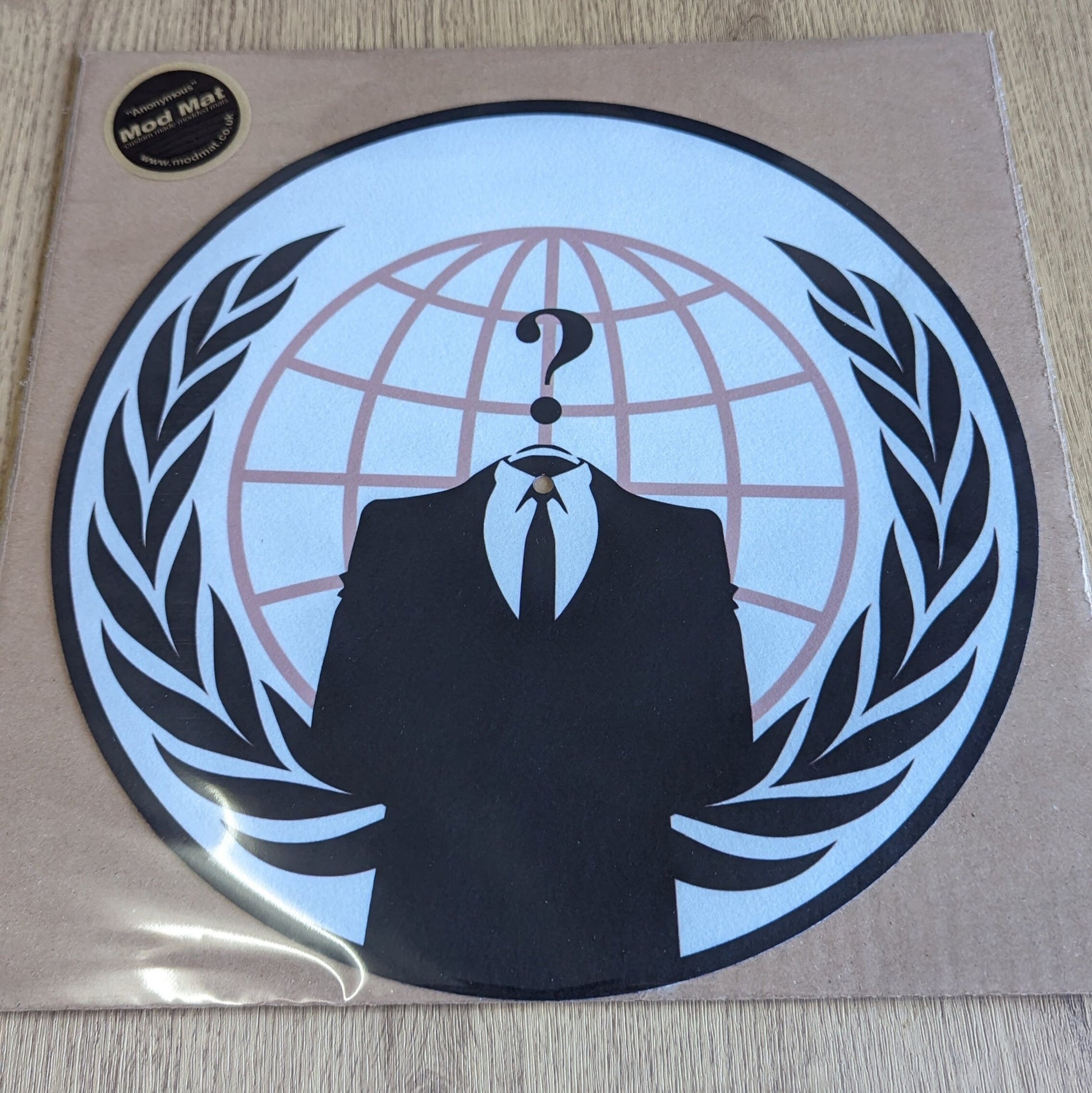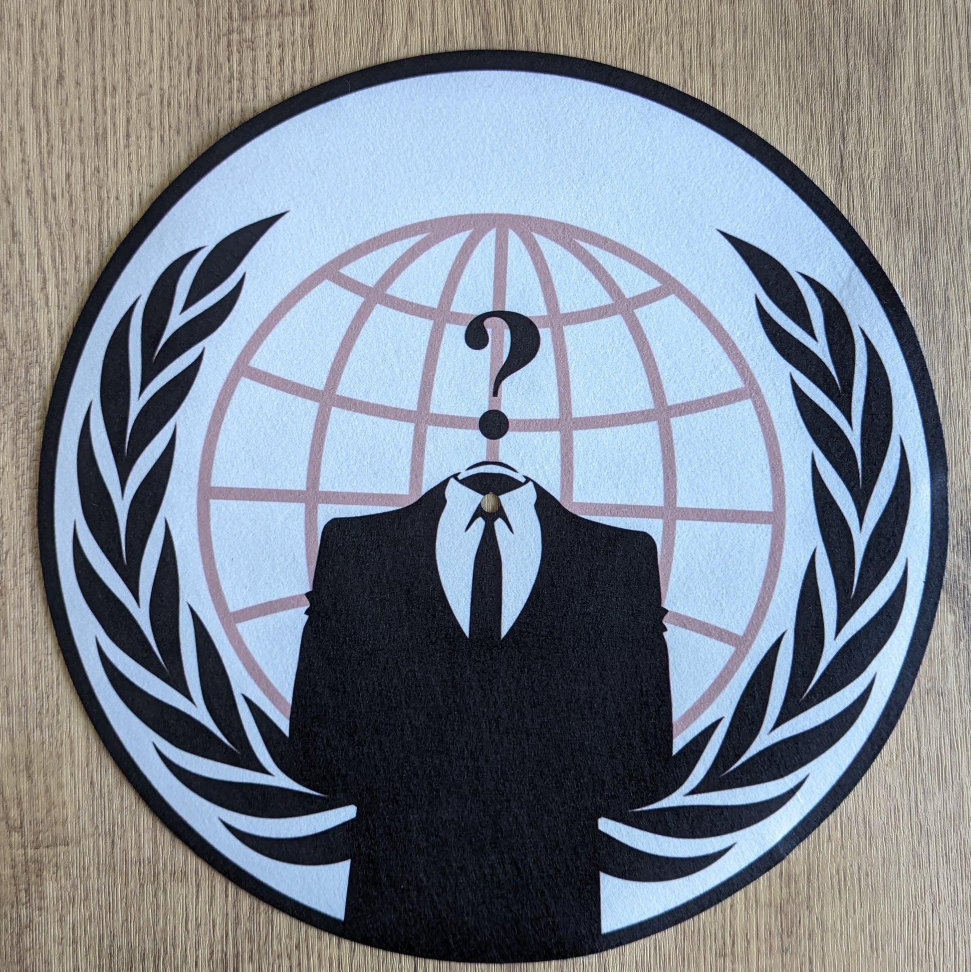 A handmade sublimated felt slip mat in either 12" or 7" Diameter. The design is of the hacker group Anonymous. Anonymous is a loosely organized and decentralized collective of individuals who engage in online hacktivism and digital activism while concealing their identities behind the iconic Guy Fawkes masks and as represented here the headless man logo . Operating as a global entity without a central leadership, Anonymous uses its collective power to protest censorship, promote freedom of information, and challenge various perceived injustices in the digital realm, often through hacking, DDoS attacks, and other forms of online disruption..So, if you want to signal your support throw these mats onto your turntables, for a psy-op of your own.