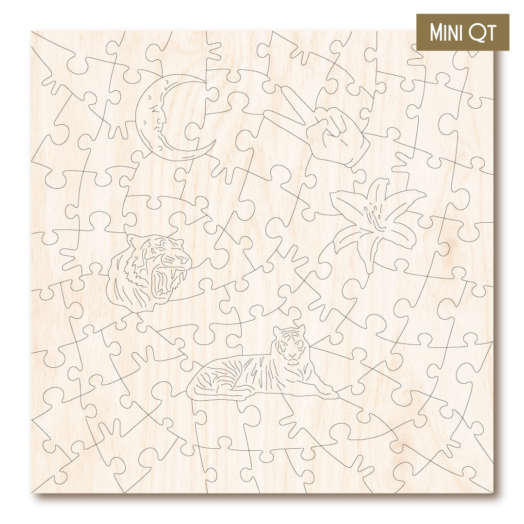 Our MINI QT puzzles are laser cut from thick, 4mm plywood and include 5 whimsies - they make a great puzzle snack!