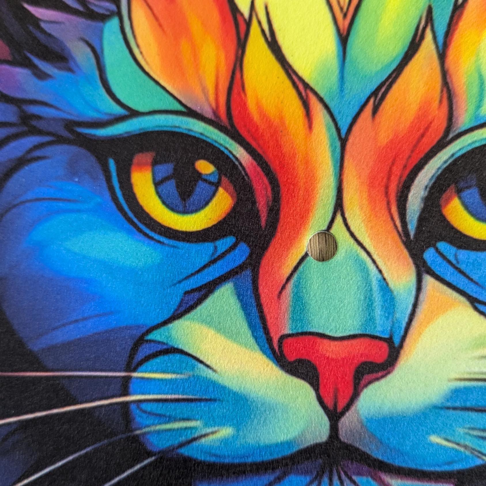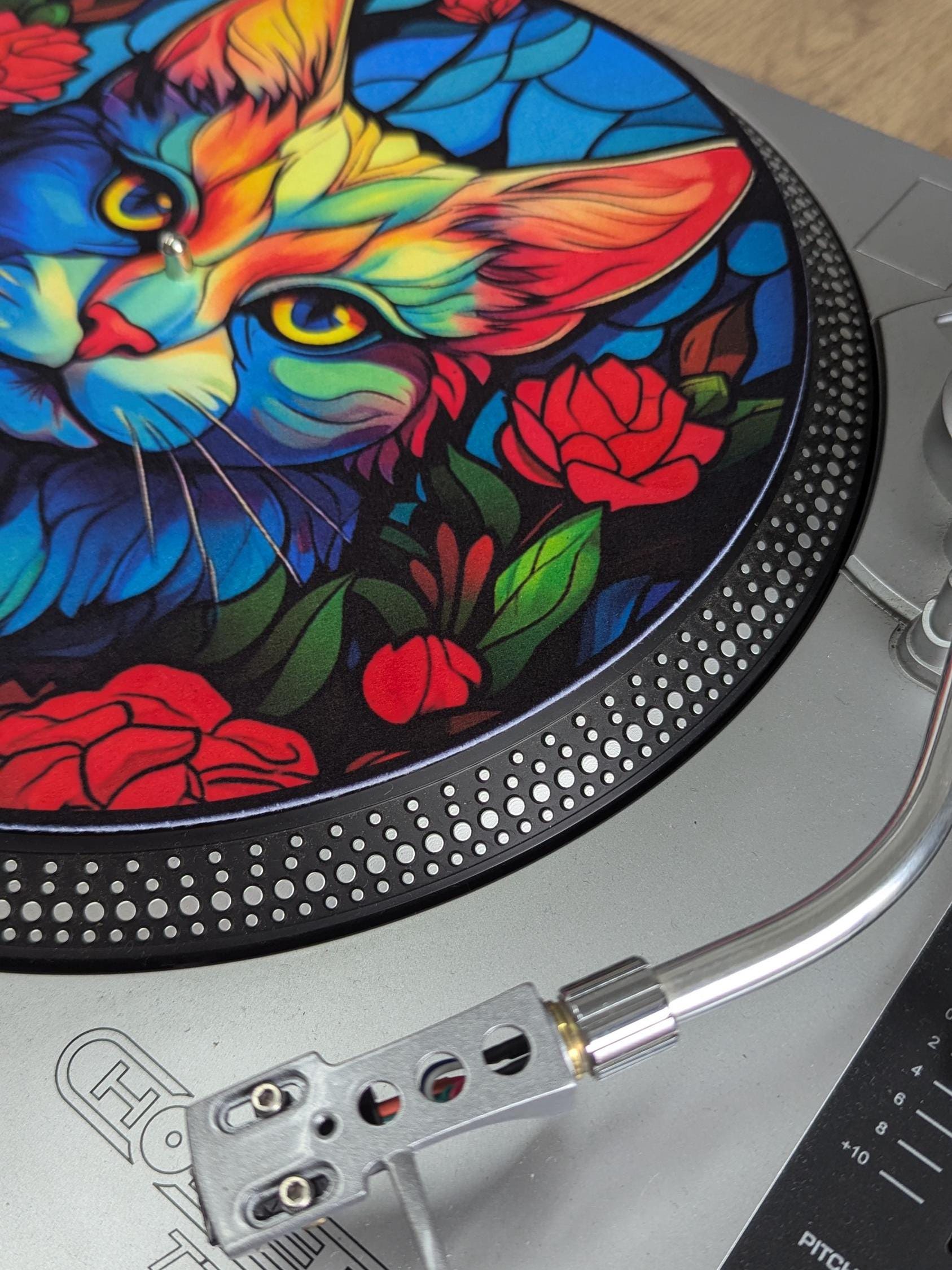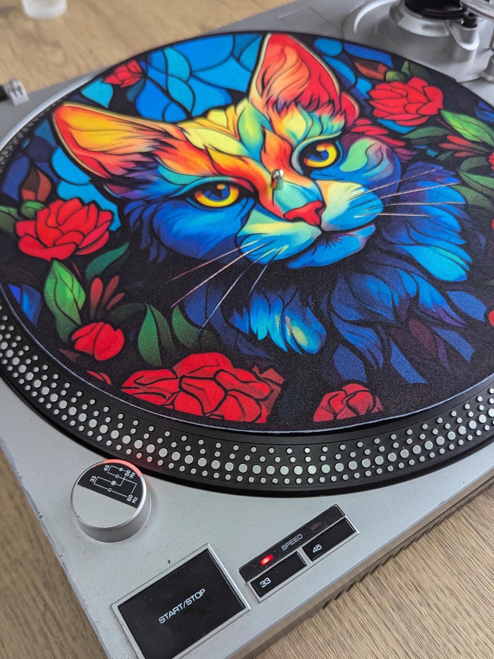 A handmade sublimated felt slip mat 12" Diameter. The design is a stained glass-like feline cat surrounded by bright red flowers . This will make a strong and attractive talking piece on your turn table especially for cat lovers. This design created by myself with ai tools and photoshop. This is a unique piece, hand crafted by myself the designer and cant be found anywhere else online. A popular design at the record fairs and shows I attend