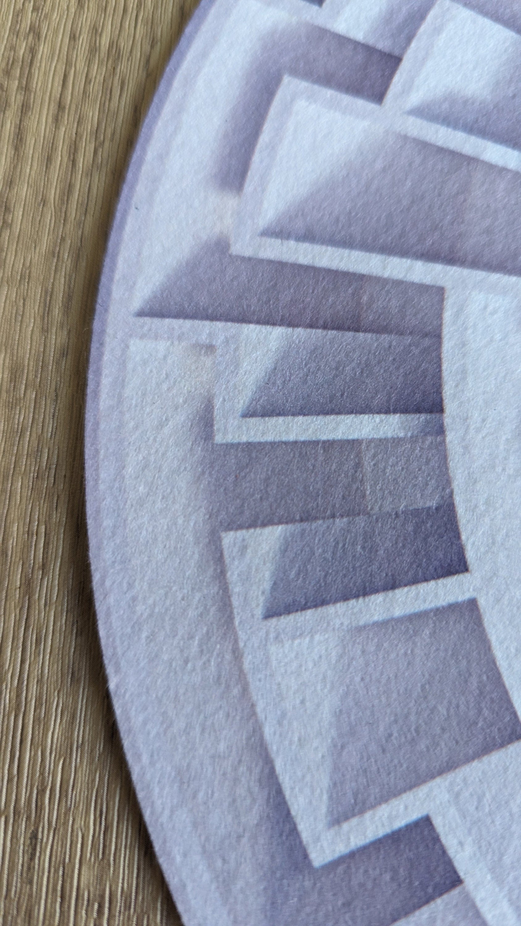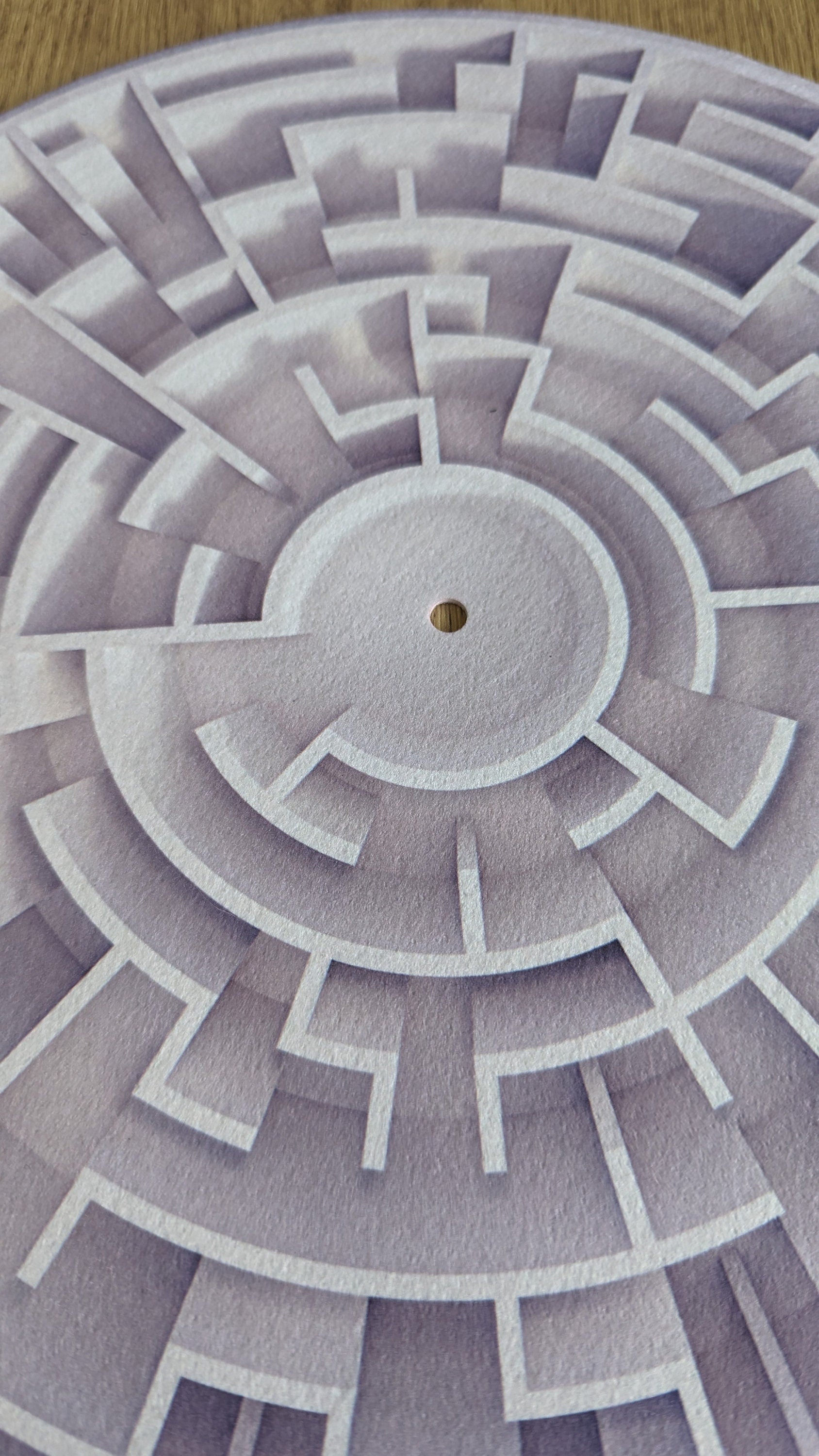 A handmade sublimated felt slip mat in either 12" or 7" Diameter. The design is a white circular 3d maze.. that literally looks a MAZE ing when it spins. The shadows and lighting on the 3D rendered maze is so subtle that as you can see it fools the eye in natural sunlight. The effect is very trippy indeed,