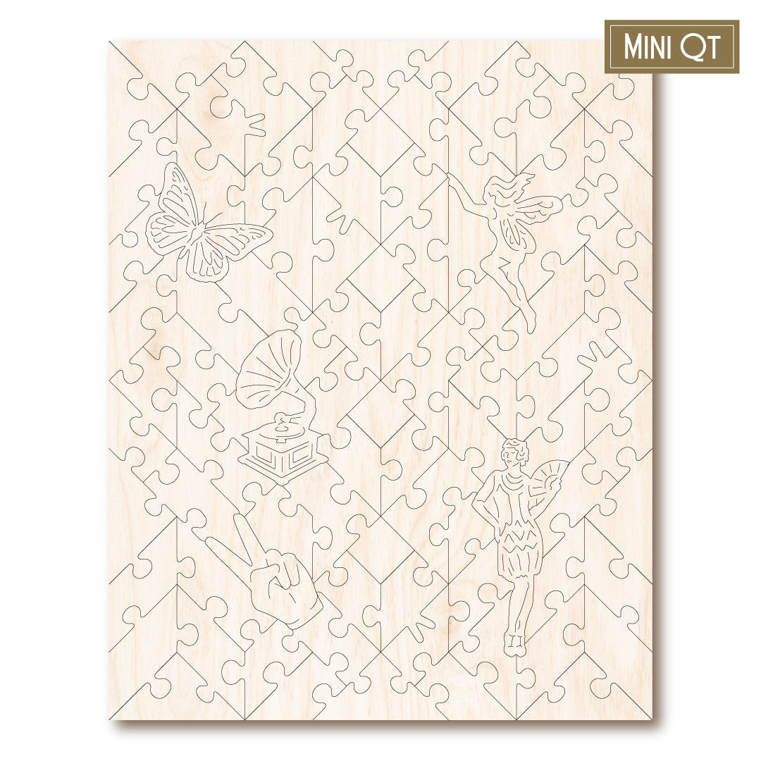 Our MINI QT puzzles are laser cut from thick, 4mm plywood and include 5 whimsies - they make a great puzzle snack!