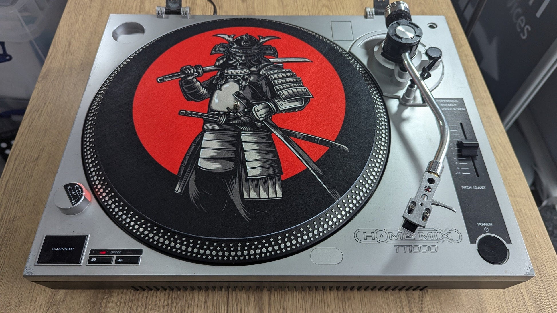 The Samurai Slipmat brings battle-ready energy to your decks with bold, high-impact artwork of a lone warrior under a crimson moon. It's a fearless blend of style and substance—perfect for DJs, turntablists, and vinyl lovers who take their craft seriously.