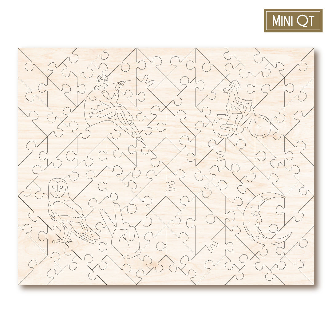 Our MINI QT puzzles are laser cut from thick, 4mm plywood and include 5 whimsies - they make a great puzzle snack!
